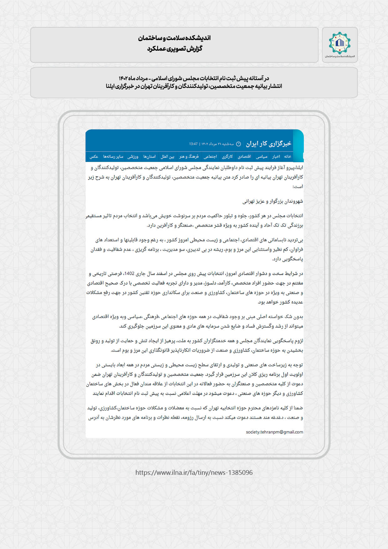 در آستانه پیش ثبتنام انتخابات مجلس شورای اسلامی / انتشار بیانیه جمعیت متخصصین، تولیدکنندگان و کارآفرینان تهران در خبرگزاری ایلنا
